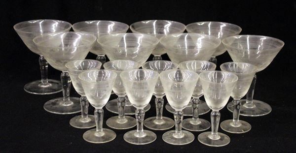 in vetro incolore, incisi a motivi curvilinei composto da otto bicchieri