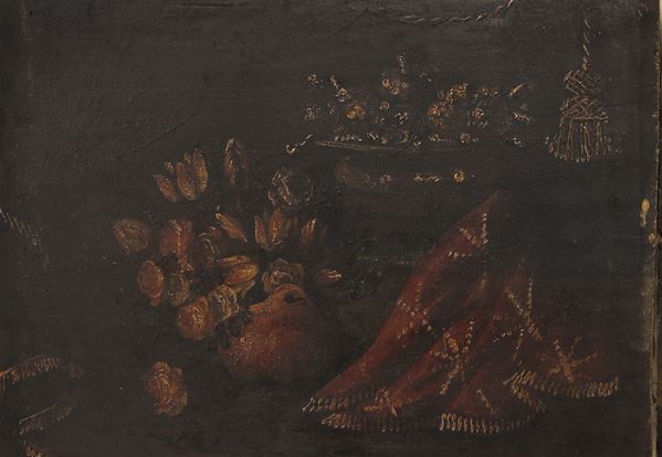 NATURA MORTA CON VASI DI FIORI, TAPPETO E NAPPA