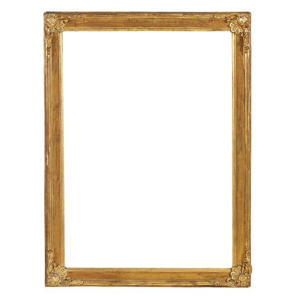 in legno intagliato e dorato, battuta liscia su fascia piatta sagomata sugli angoli, ornati da conchiglie tra girali, bordo rilevato si porta a muro; ingombro cm 101,7x77, luce cm 86,7x62