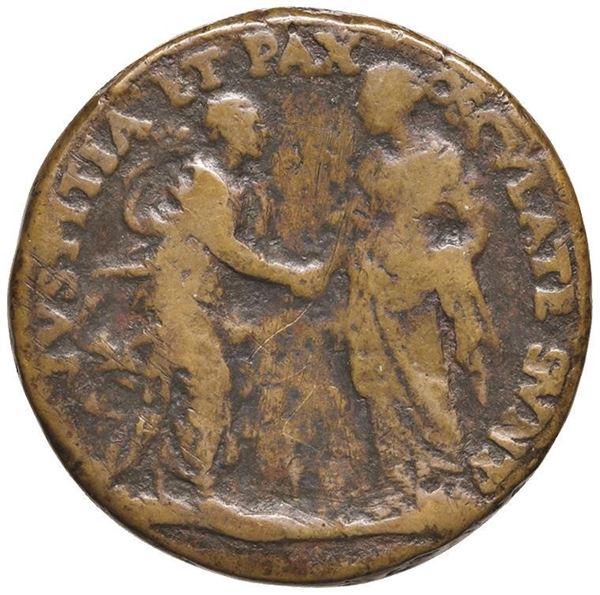 Ae gr. 24,06 mm. 32 D/ ANT GRIMANVS DVX VENETIAR Busto del Doge a s. con il corno e il mantello dogale R/ IUSTITIA ET PAX OSCULATE SUNT La Pace e la Giustizia si stringono la mano Hill 507 Pollard 186