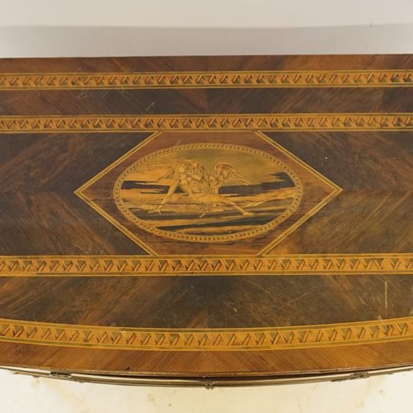 in noce intarsiato, sul piano Leda e il Cigno entro medaglione, cm 23x61x94