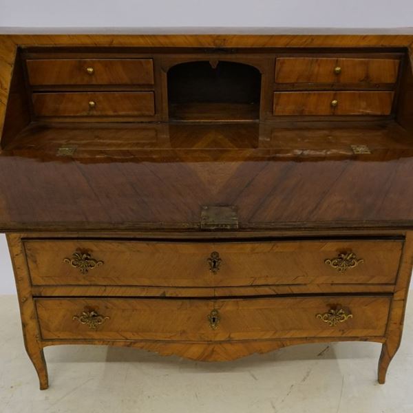 in noce, fianchi mossi, tre cassetti, sportello a ribalta con internamente cassettini.