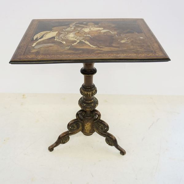 in noce, piano intarsiato con figura di cavalieri in battaglia, cm 67x52x78
