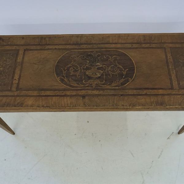 in noce intarsiato, gambe a spillo, cm 123x46x50, difetti