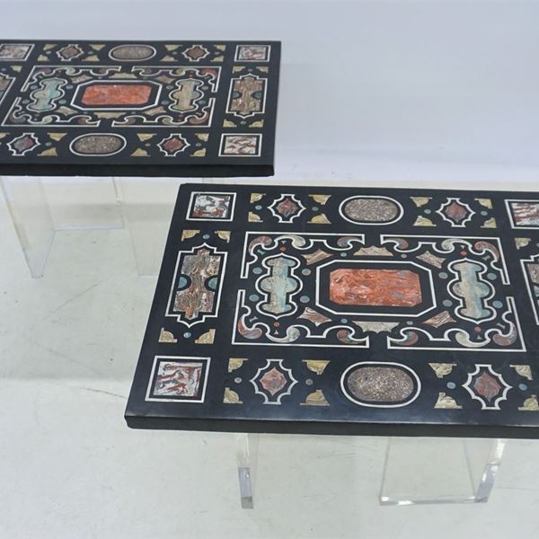 a motivi geometrici con vari colori, basi in plexigass, formanti tavolini da fumo.