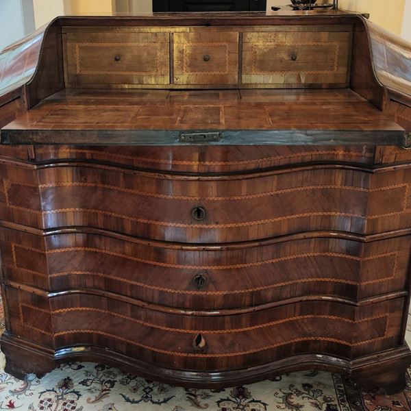 in noce filettato, fronte mosso tre cassetti, sportello con all'interno cassettini