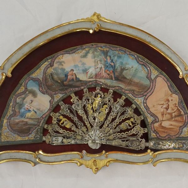 Due ventagli, Francia, sec. XIX, pitturati a scene campestri, entro teche, cm 62x40 (2)