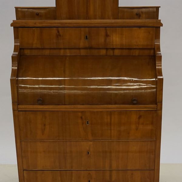 in ciliegio con sportello a rullo, internamente piano scorrevole e quattro cassetti e vano a giorno, tre cassetti nella parte inferiore, tre piccoli cassetti nella parte superiore, cm 104x56x152.