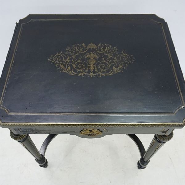 Tavolino, in stile Boulle, sec. XIX, in legno laccato nero con intarsi in metallo dorato, un cassetto, gambe scanalate riunite da traversa, alette laterali, in cm 70x57x74