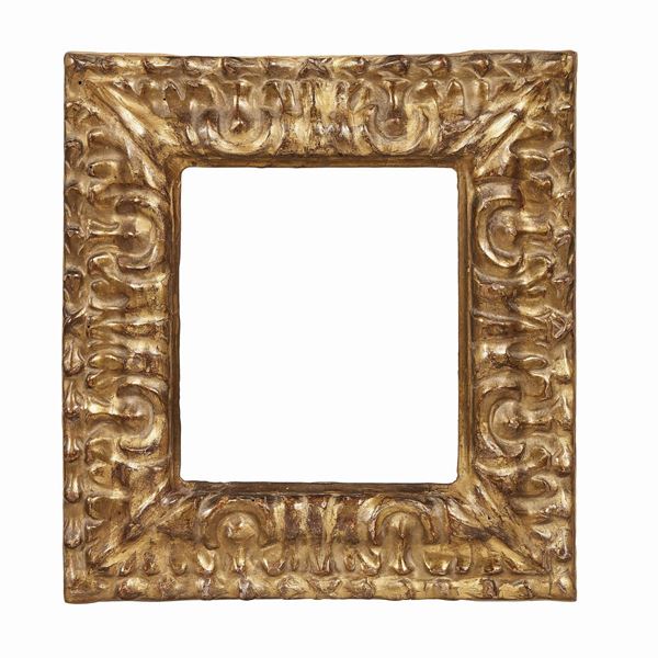 in legno intagliato e dorato, battuta si apre su fascia che scende in motivo a a foglie aperte rivolte verso l’esterno; ingombro cm 32,5x29 e 33x29,5, luce cm 19,2x16,2 e 18,5x15,8