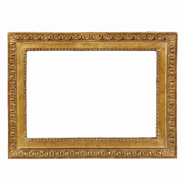 in legno intagliato e dorato, battuta a perline che si porta su fascia e sale su baccellatura; ingombro cm 29,5x40,5, luce cm 20,5x31,5