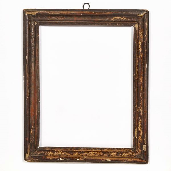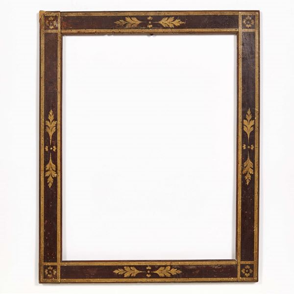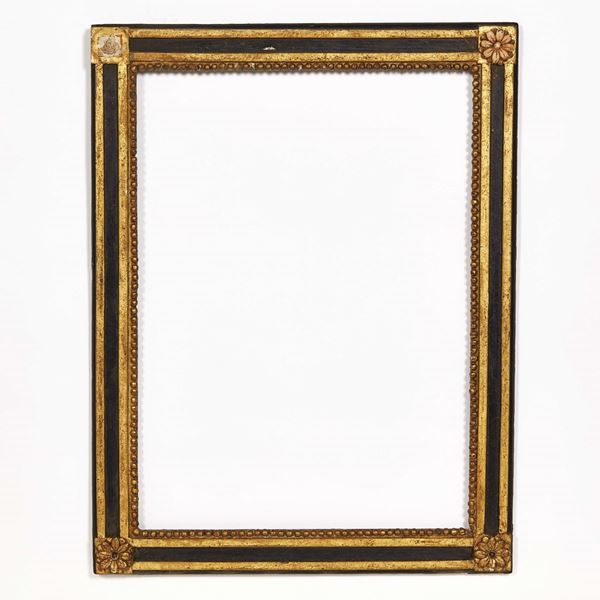in legno ebanizzato e dorato con applicazioni agli angoli, cm 58x44, luce cm 47,5x34