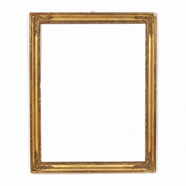 in legno intagliato e dorato e pastiglia, fascia con decori a rilievo agli angoli, ingombro cm 67,5x53, luce cm 58,5x44