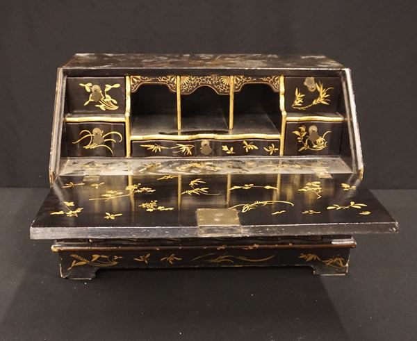 in legno laccato con decori a rilievo raffiguranti, paesaggi e fiori, uno sportello ed un cassetto, internamente cassettini e vani