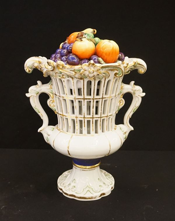 in ceramica bianca, copro traforato, due anse e coperchio con frutti, alt. cm 40