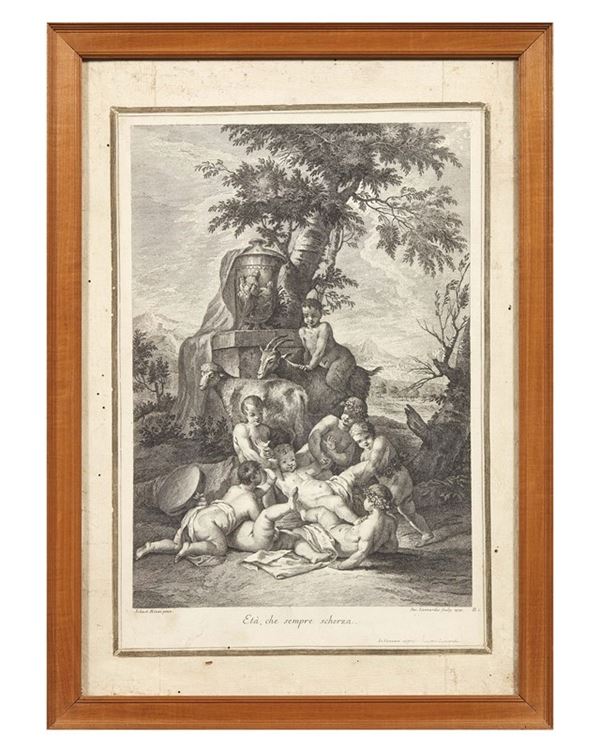 coppia di stampe, acquaforte, carta vergellata applicata su tela, cm 41x27