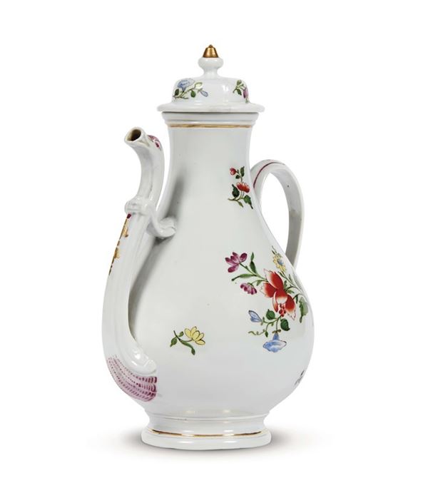 in porcellana dipinta in policromia, corpo piriforme, versatoio allungato e terminante in testa di serpe, ansa a orecchio, coperchio piano con presa a bottone. Il decoro mostra il motivo “a mazzetto”, ma caratterizzato da una rosa centrale scontornata e fioretti sparsi. La curva dell’ansa e l’attacco del cannello sono impreziosite da tocchi di porpora; alt. cm 26,5, largh. massima cm 17,7, diam. cm 13,8