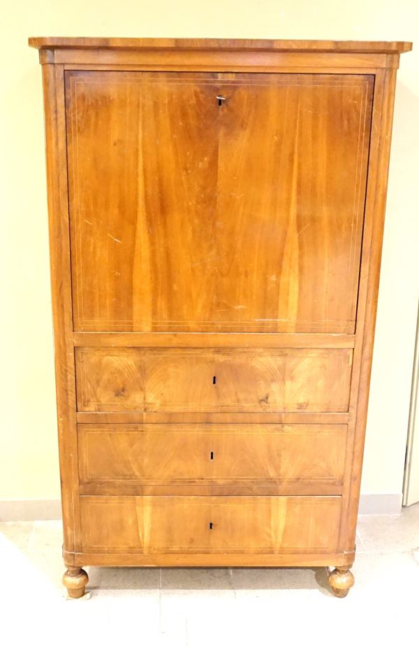 in noce filettato, tre cassetti e sportello a ribalta, interno quattro cassettini e vani a giorno, cm 91x49x153