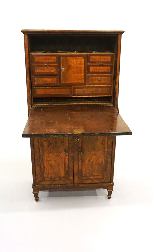 Secretaire, sec. XIX, in radica di noce, tre sportelli di cui uno a ribalta, internamente sei cassettini, sportelo e vano a giorno, cm 77x41x148