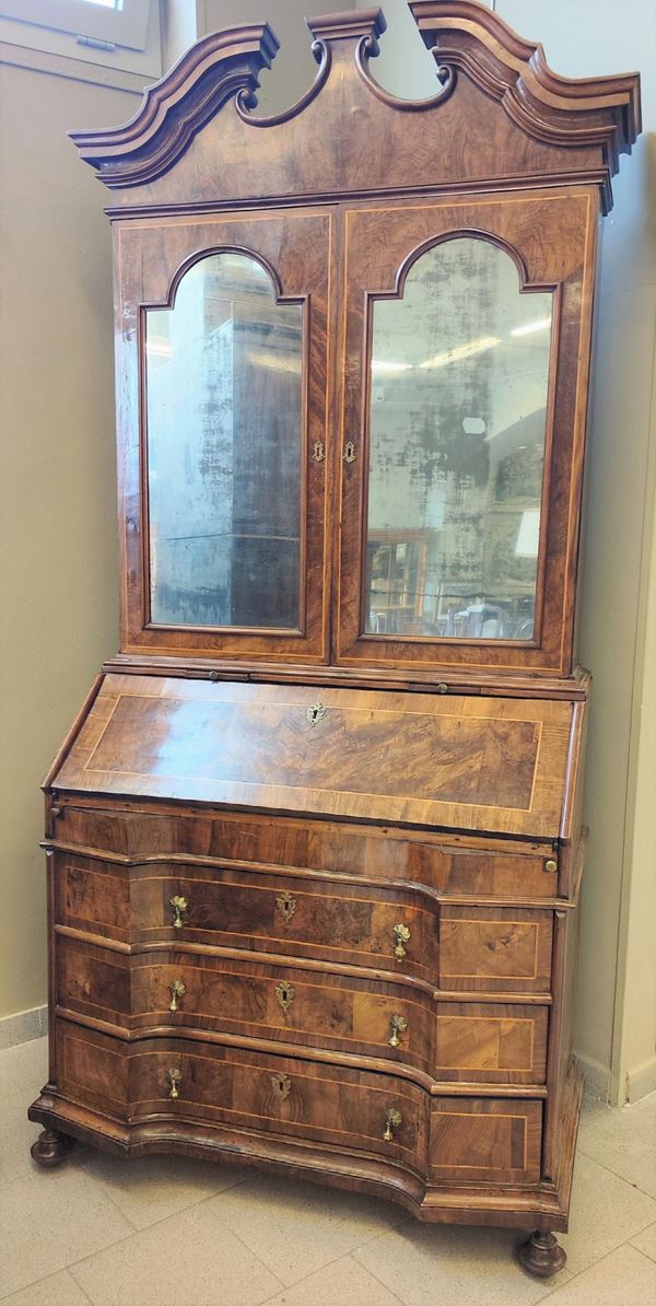 in noce filettato e radica di noce, parte superiore a due sportelli, parte inferiore con fronte mosso, ribalta e tre cassetti, cm 245x106x52, lievi danni e restauri
