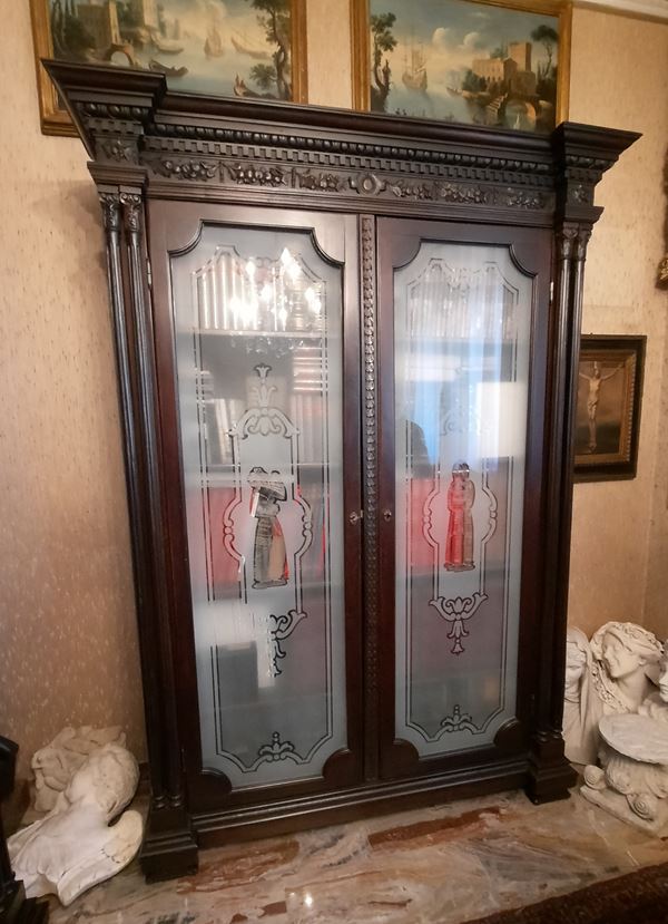 in noce intagliato, ciascuna a due sportelli con vetri, cm 157x53x20
