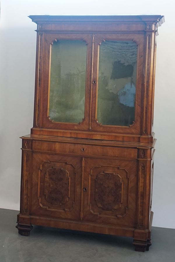 in noce e radica di olivo, parte inferiore a due sportelli ed un cassetto, la superiore con due sportelli a vetri, cm 131x58x220, lievi danni