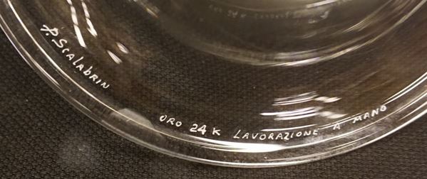 in vetro di Murano con decoro in oro a piuma di pavone, alt. cm 18, diam. cm 27. Firmata P. Salabrin