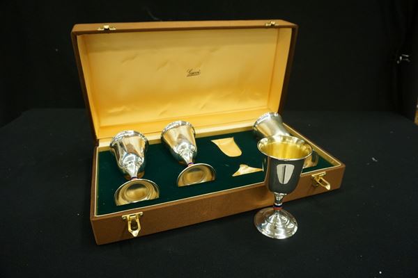 quattro bucchieri a calice in metallo argentato, alt. cm entro scatola