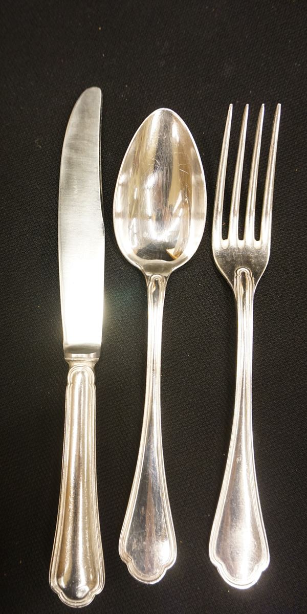 in metallo argentato, finali dei manici trilobati, composto di settantanove pezzi, entro scatola in legno