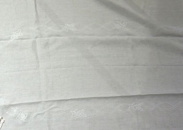 in lino bianco ricamato a fiori e motivi geometrici, completa di quattorcici tovaglioli, cm 340x170