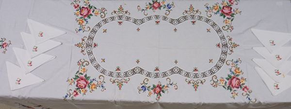 in cotone, con ricami a fiopri, completa di 8 tovaglioli