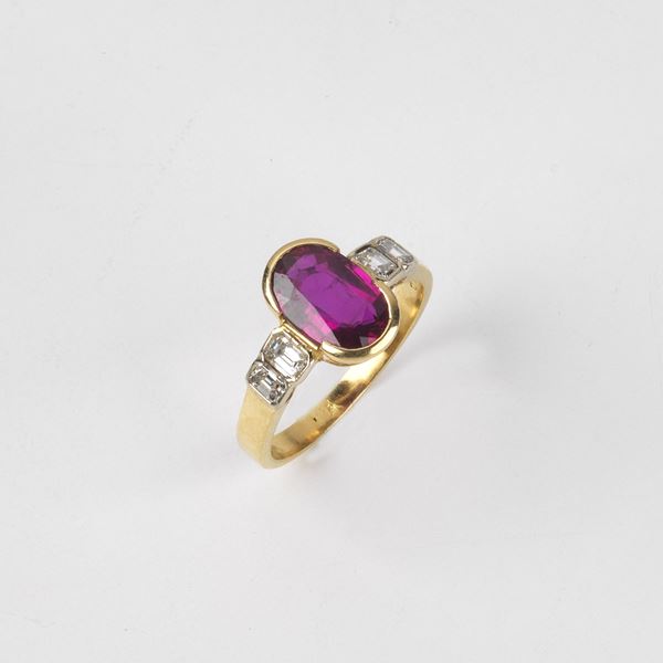 al centro un rubino di forma ovale, affiancato da quattro diamanti taglio cuscino g 5 , misura 18