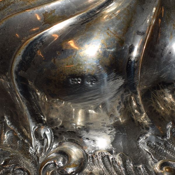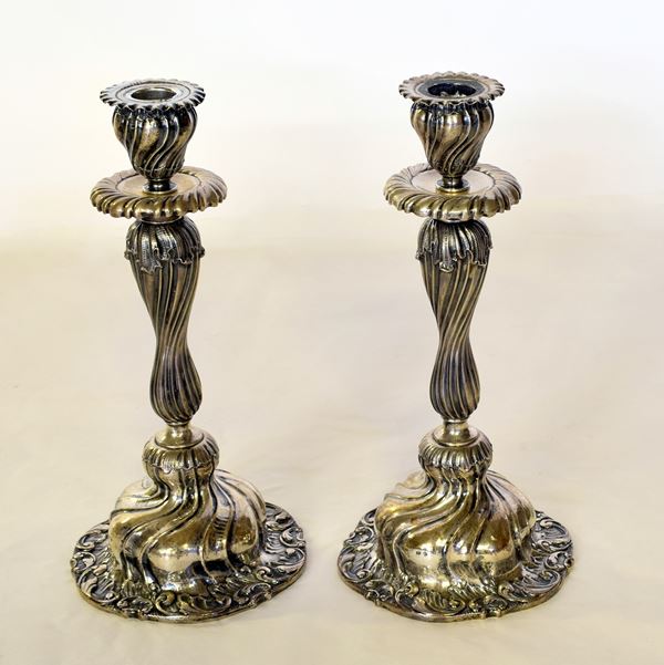 in argento , sbalzato e cesellato , fusto a balaustro scanalato , base cirocolare decorata a volute,