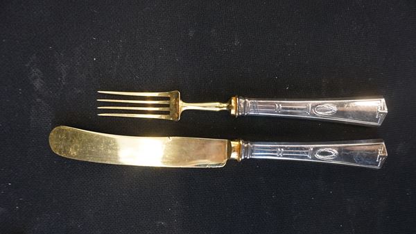 composto di dodici forchette, undici coltelli e due posate da servizio in acciaio, acciaio dorato e guarnizioni in argento
