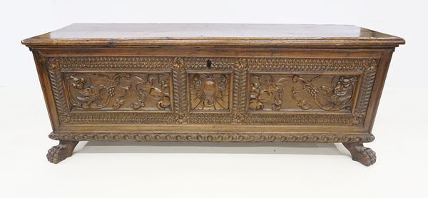in noce, fronte intagliato con stemma e girali, cm 172x58x65