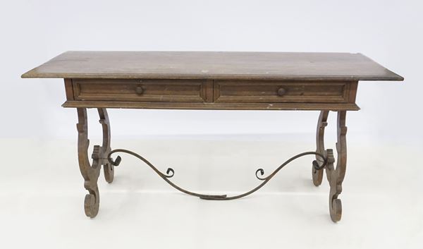 in noce, fascia a due cassetti, gambe a lira, traverse in ferro, cm 171x70x82