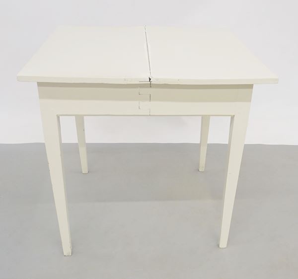 in legno laccato, un cassetto, piano apribile a libro, gambe tronco piramidali, cm 82x39x76