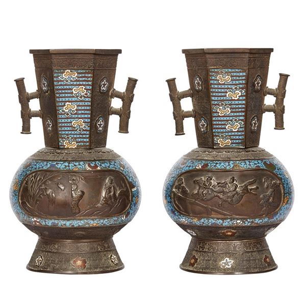 decorati in smalto cloisonnè con le anse a forma di bambù decorato con fiori stilizzati e uccelli a basso rilievo, alt. cm 40,5