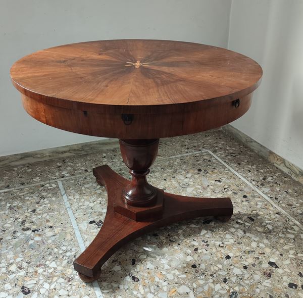 in noce con piano circolare intarsiato, gamba tornita, cm 97x80