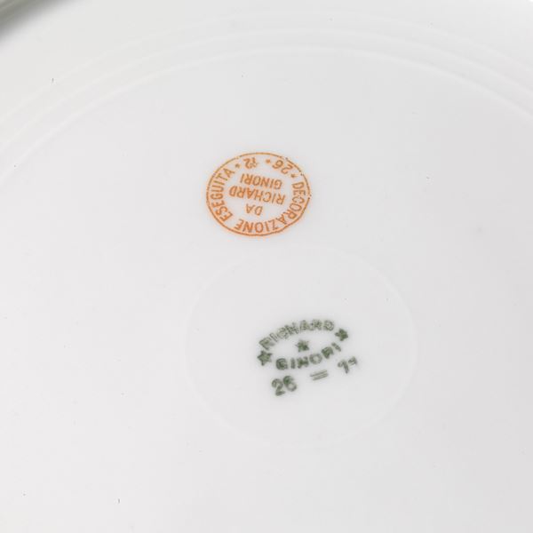 27 piatti piani, 8 piatti fondi, 2 piattini, zuppiera, insalatiera, 2 raviere, salsiera, 4 vassoi vari