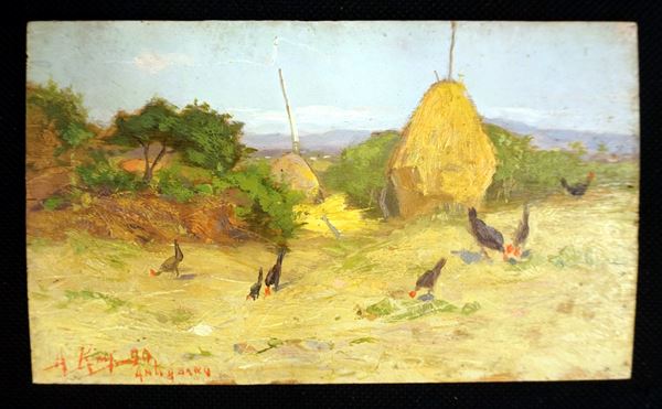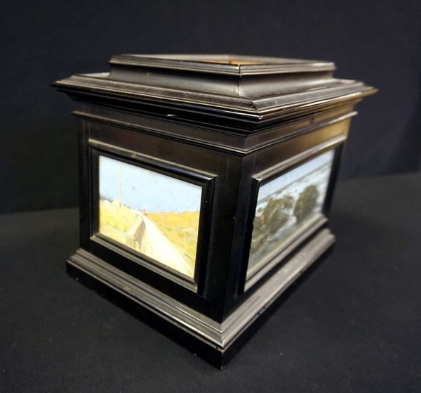in legno ebanizzato di forma rettangolare, fianchi e coperchio con cinque piccoli dipointi, olio su tavoletta raffiguranti marine e paesaggi, cm 28x20x23