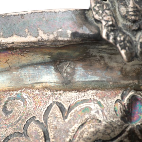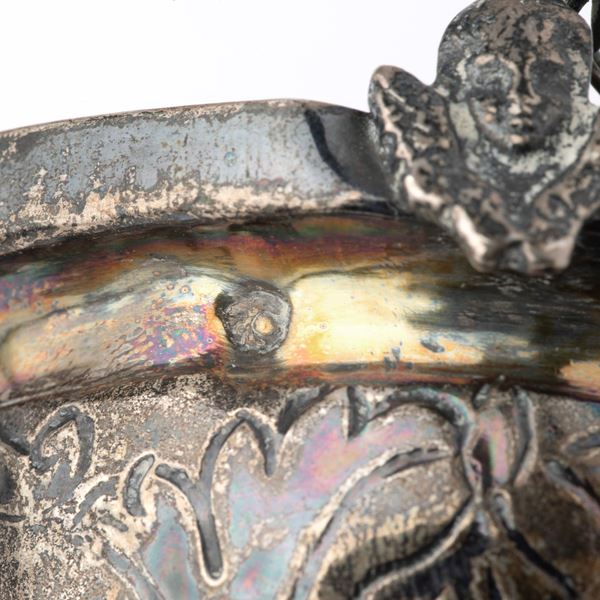 in argento sbalzato a putti e contenitori sorretti da maglie intrecciate, su base in plexliglass