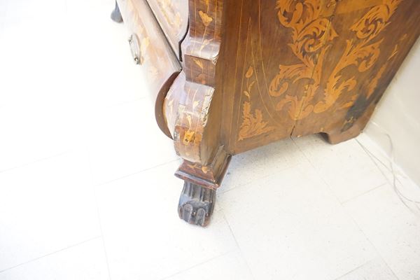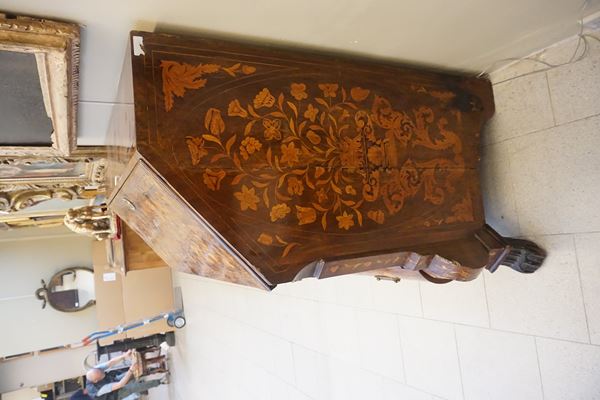 in mogano riccamente intarsiato in bois de rose e altre essenze con motivi di fiori, cornucopia, farfalle e volute, piano da aprirsi celante scarabattolo interno con sette cassettini, due vani a giorno e uno sportello centrale con specchio e segreto all’interno, fronte con due cassetti appaiati e altri due sottostanti di cui l’ultimo lievemente bombato, pendaglina sagomata, piedi anteriori a zampa ferina, cm 106x100x65
