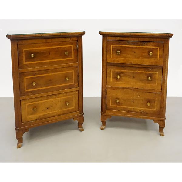in noce intarsiato, uno con uno sportello ed un cassetto, l'altro a tre cassetti, piedi sagomati, cm 59x44x83