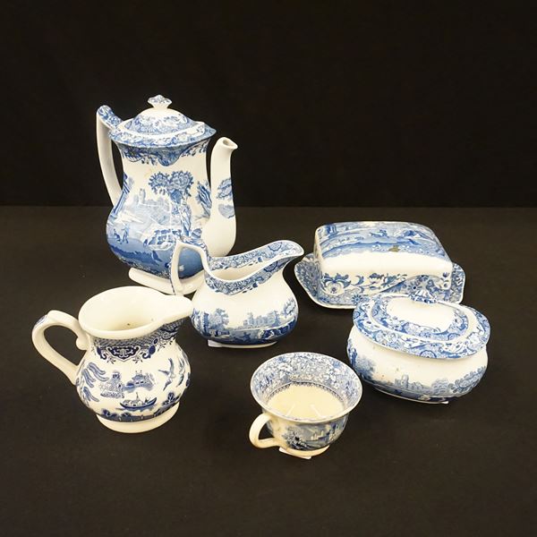 in terraglia, composto da: teiera, due lattiere, una tazzina, un porta burro, una zuccheriera, sei tazze con piattini, una zuppiera, due porta salse, un vassoio circolare, una coppa circolare, una coppa squadrata e un piattino da burro