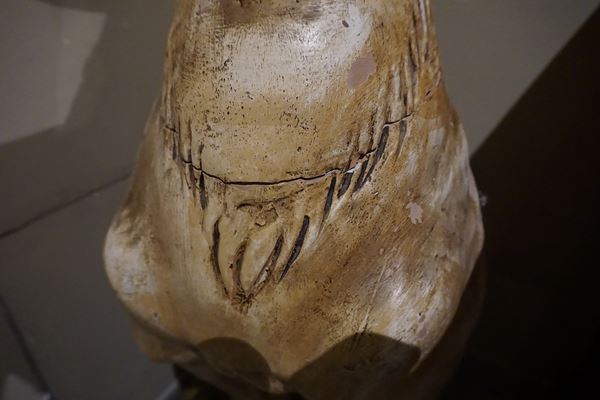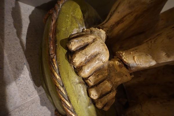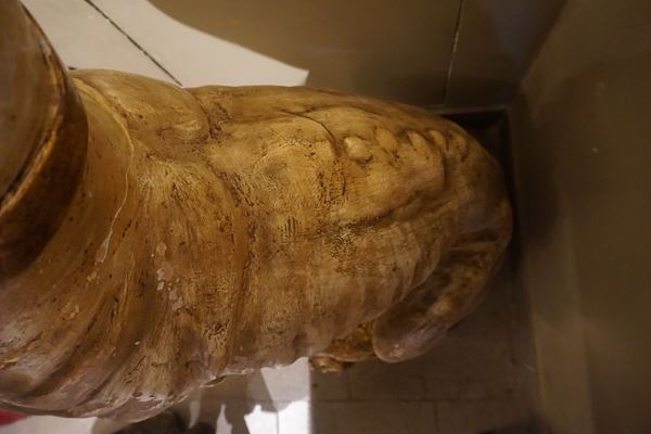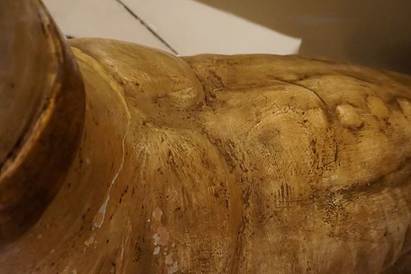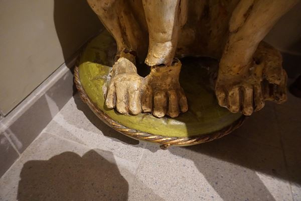 in terracotta smaltata, con occhi in vetro, alt. cm 98, rotture e da restaurare