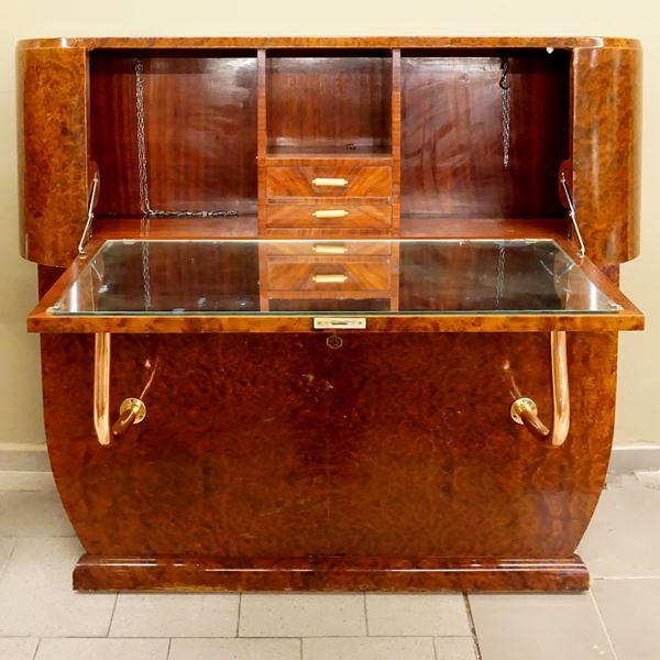 in radica di mogano, parte superiore con sportello a calatoia, riunito al pannello di fondo da due elementi in rame, interno con cassettini, vani e specchio, cm 140x34x135