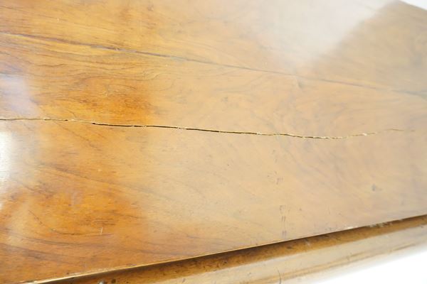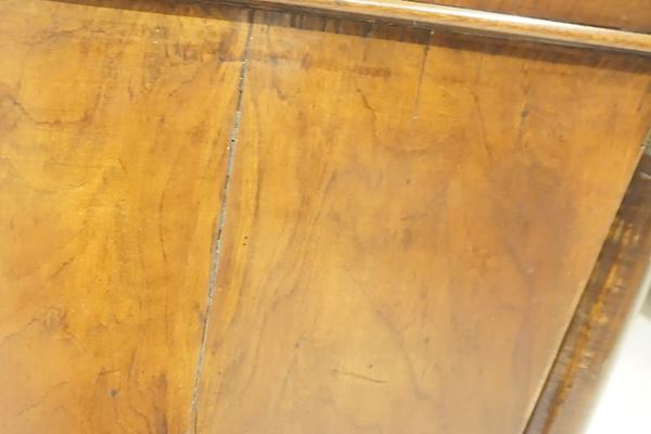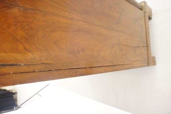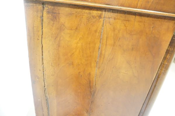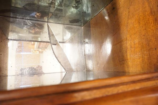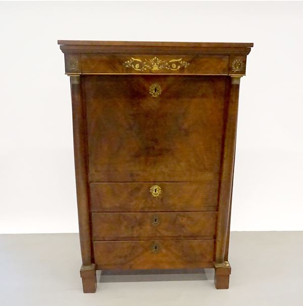 in mogano con guarnizioni in bronzo, quattro cassetti, uno sportello a ribalta e interno con cassettini e vano a giorno, specchio rotto, cm 97x46x144