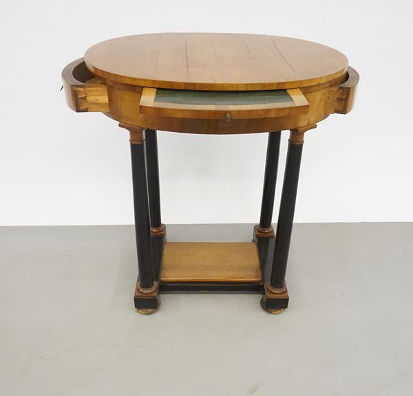 in ciliegio di forma ovale, sostegni a colonne a capitelli ebanizati sottopiano estraibile, due cassetti laterali, cm 70x52x77