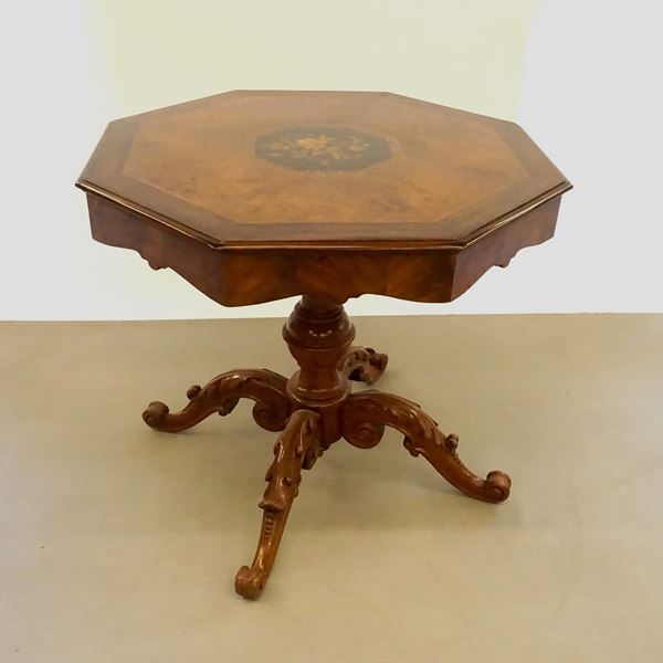 in mogano, piano ottagonale con intarsio al centro, gamba tornita su quattro piedi sagomati,cm 67x78